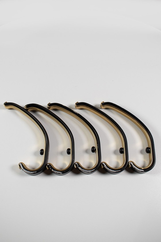 Juego de 5 ganchos de pared de metal y latón. Estos ganchos vintage presentan un ligero desgaste en la pintura negra, lo que les da carácter. Se pueden colgar de forma que los tornillos no queden a la vista. En buen estado vintage.