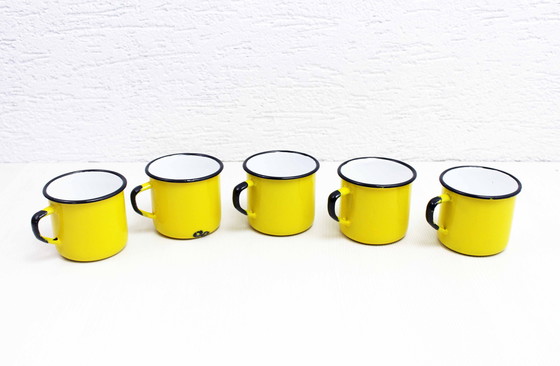 Sirva su té, infusiones o café con este hermoso juego de tazas de metal esmaltado en amarillo y blanco. Este servicio aportará un toque de historia y color a su mesa. Totalmente funcional, a pesar de algunas señales de uso. Ver fotos. Años 80/90. Dimensiones: Alto 8 cm, Diámetro 9 cm, Ancho con asa 11 cm.