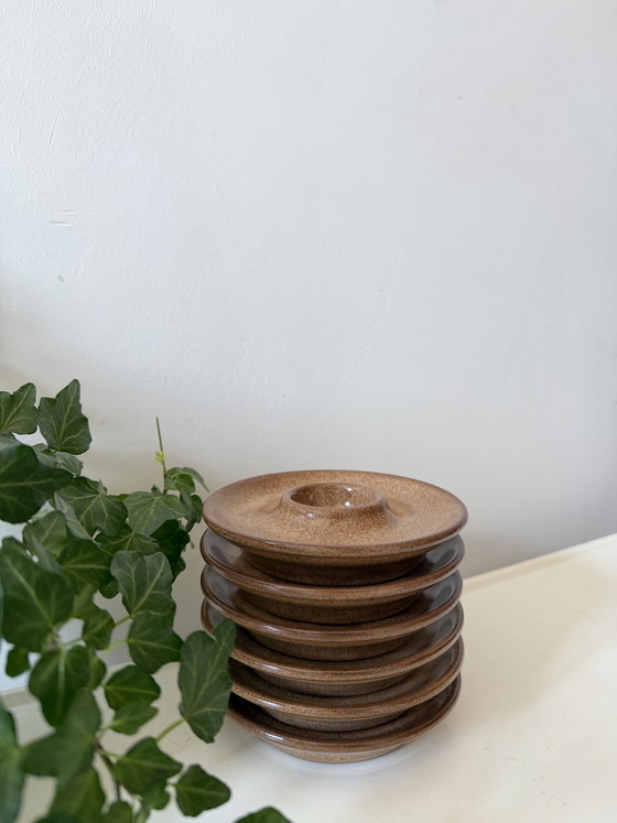 Precioso juego de hueveras con un cálido esmalte marrón jaspeado. De forma ancha y con un pequeño relieve en el centro para el huevo, se diferencian ligeramente de las hueveras tradicionales. Q114