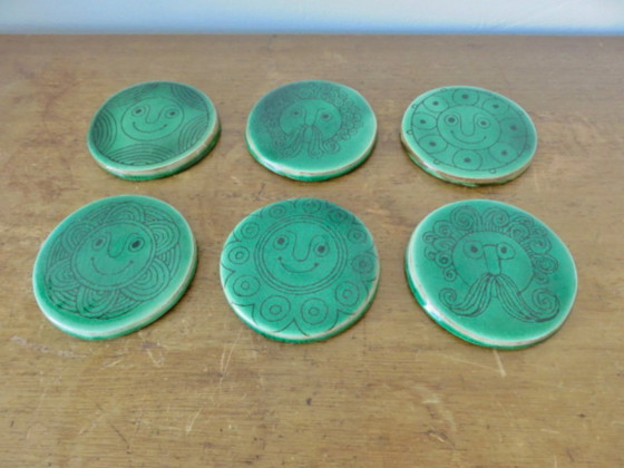 Serie de 6 posavasos de cerámica verde craquelada, caras estilizadas, años 60 ó 70. Las 6 caras son diferentes. Diámetro 9,5 cm. Posavasos de fieltro rojo. En excelente estado. Un modelo raro y muy original.