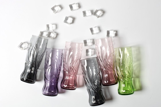 Juego de seis preciosos vasos de estilo Art Nouveau diseñados por McDonald's para Coca-Cola, con la palabra "Coca-Cola" grabada y, entre otros detalles, una mariposa. Disponibles en cuatro colores.