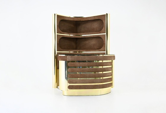 El conjunto incluye un armario con tres estantes iluminados en ante y metal dorado. También incluye un mostrador en ante y metal dorado con superficie de espejo, un frigorífico nuevo y una vitrina con estante. El suelo está alfombrado.