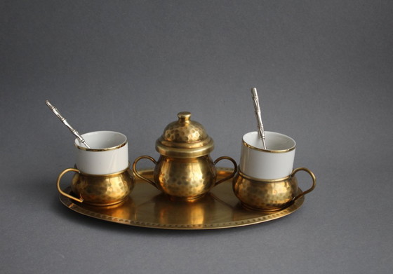 Juego de café expreso Ottone Battuto A Mano para 2 personas, de porcelana, con soportes de latón, firmado.