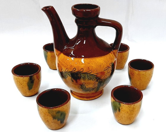 Juego de cerámica folklórica para brandy, aguardiente o licor. Consta de una jarra y seis copas pequeñas. Cerámica esmaltada en marrón y amarillo, pintada con delicados motivos florales. Totalmente hecho a mano. El juego se encuentra en muy buen estado, aunque data del siglo pasado. No presenta defectos en las piezas.