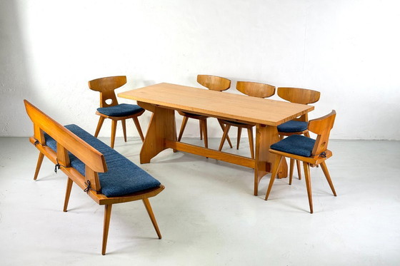 Este hermoso juego consta de cinco sillas, un banco y una mesa de pino macizo. El banco y las sillas conservan sus cojines originales de color azul noche. Toda la tapicería está en excelentes condiciones y sin daños.