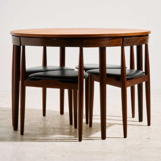 Una auténtica joya de la historia del diseño de los años 50 que refleja el espíritu del diseño danés. Juego de comedor de teca diseñado por Hans Olsen para Frem Røjle. El conjunto consta de cuatro sillas y una mesa de comedor con una extensión. Gracias a su diseño único, el respaldo de la silla se adapta perfectamente al borde de la mesa. La superficie presenta algunos arañazos, manchas y desgaste. Dimensiones: Mesa de comedor: 105-156 x 73 x 105 cm /// Silla de comedor: 50 x 71 x 42 cm, Altura del asiento: 43 cm