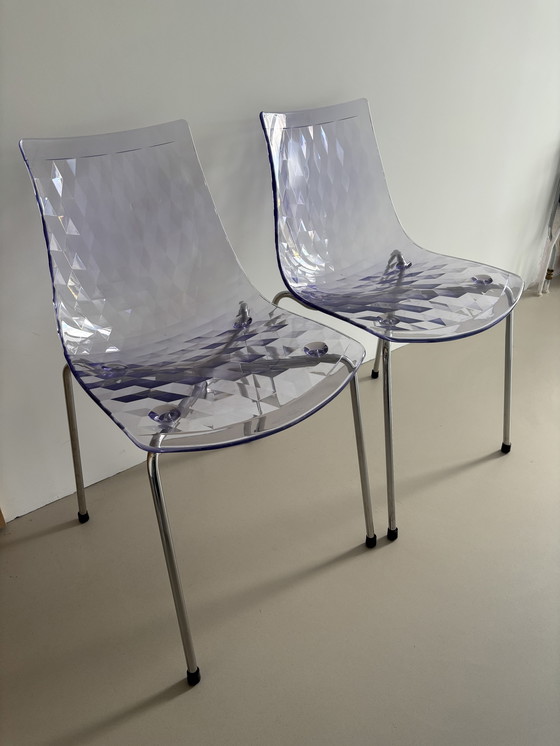 Estas dos sillas "ICE" son originales de la marca de diseño italiana Calligaris. El modelo "ICE" se caracteriza por su plástico transparente (tecnopolímero) con triángulos tallados con diamante. Marcado en la parte inferior (ver foto). La robusta base es de metal cromado. Asientos cómodos; ideales para múltiples usos. Las sillas están en buen estado. Dimensiones: Alto 81 cm; Alto asiento 47 cm; Fondo 40 cm; Ancho 44 cm. Nota: Si decide recogerla o que se la envíen, recibirá una silla adicional. Esta tiene una abolladura en la parte inferior del respaldo. La silla sigue funcionando perfectamente.
