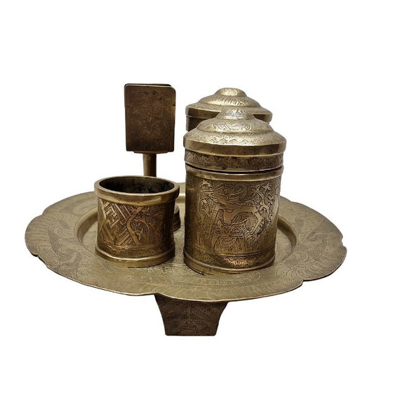 Juego de fumar indonesio de latón vintage, de mediados del siglo XX. Este juego, elaborado artesanalmente y grabado, se utilizaba para guardar accesorios para fumar como puros, cerillas y cenizas. Consta de una bandeja, dos tarros con tapa, un vaso abierto y un soporte para cerillas.