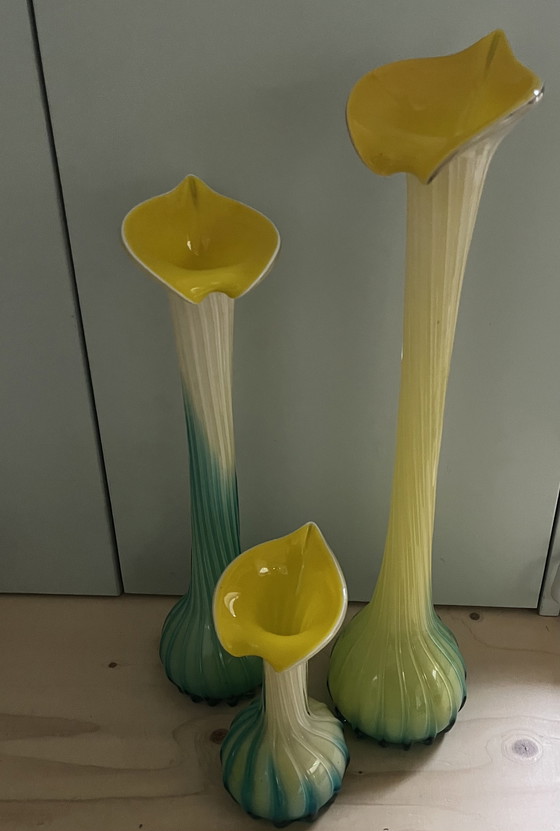 Este exquisito conjunto de jarrones tulipán de Murano encarna la elegancia y el arte característicos de la cristalería de Murano. Cada jarrón luce una grácil forma de tulipán, con vibrantes tonos amarillos, verdes y azules que se funden armoniosamente para crear un efecto visual deslumbrante.