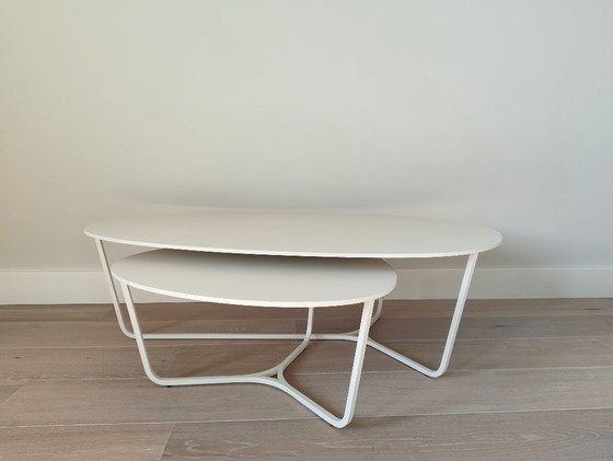 Este es un hermoso juego de mesas de centro ovaladas, hechas de cerámica blanca (RAL 9010).