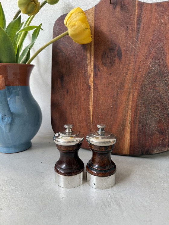 La combinación de madera oscura y detalles plateados crea un aspecto cálido y lujoso. De tamaño compacto, pero con una presencia imponente. Perfectos para la mesa o para una cocina elegante.