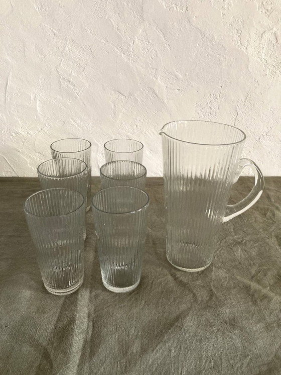 Aquí tenéis un magnífico juego antiguo de naranjada en cristal acanalado, hecho a mano.