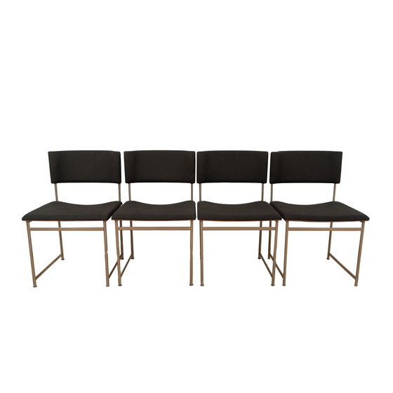 Juego de cuatro (4) sillas de comedor SM08 de Cees Braakman para Pastoe. Están tapizadas en tela gris oscuro. Incluyen asiento y respaldo de madera sobre una estructura de metal gris.