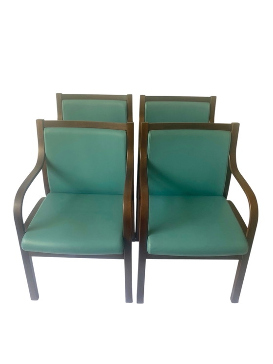Cuatro sillas fabricadas en la década de 1970 por Poltrona Frau, diseñadas por Vittorio Gregotti, Lodovico Meneghetti y Giotto Stoppino. Estructura de madera curvada y nogal negro. Asiento y respaldo de madera curvada, acolchados y tapizados en cuero turquesa. Estado: Cuero en excelente estado, con pequeñas abolladuras en la madera y decoloración de la tela en la parte inferior. Color: Turquesa. Material: Cuero y nogal. Dimensiones: Largo 50 cm - Fondo 55 cm - Alto 85 cm - Alto del asiento 45 cm.