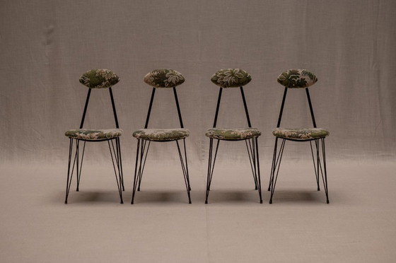 Divertido juego de cuatro sillas de comedor modernistas italianas. Fabricadas con una elegante y esbelta estructura de acero negro combinada con asientos recién retapizados. Juego intrincado entre el suave tejido con motivos de bosque que contrasta con las marcadas líneas negras. El tacto suave y el impresionante uso de texturas hacen que estos ejemplares sean muy especiales. Precio del juego de cuatro.