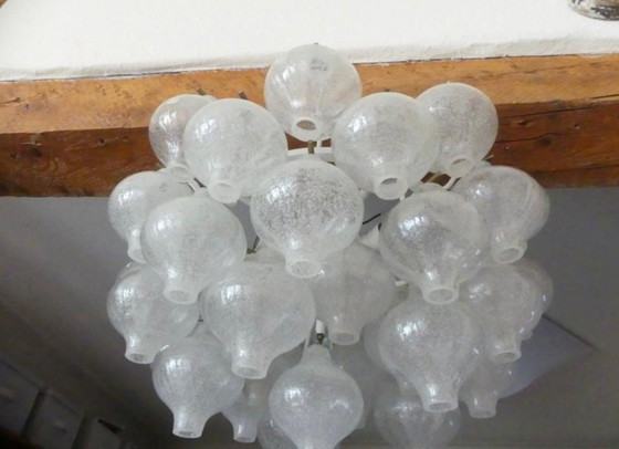 Una preciosa lámpara de techo de la marca Kalmar. Se estima que data de 1950-1960. 41 esferas de cristal cuelgan de una estructura lacada en blanco. La placa de techo es de latón. La lámpara, con un diámetro aproximado de 42 cm, tiene 10 portalámparas E14. Se encuentra en muy buen estado; la laca blanca presenta pequeñas grietas que no son visibles cuando la lámpara está colgada.