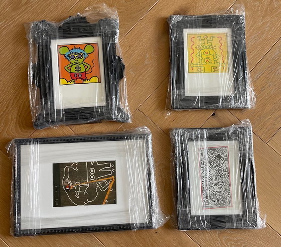 Se vende: juego de 4 postales litográficas offset de Keith Haring (1958-1990), icónico artista estadounidense conocido por sus líneas atrevidas, colores vibrantes y arte urbano con conciencia social. Incluye "Untitled Tarp" (1983), "Untitled" (1984), "Andy Mouse" (1986) y "KH op de Centrale Markthallen te Amsterdam", cortesía de George Mulder, Nueva York. Impresas en Holanda, todas enmarcadas y en buen estado, listas para iluminar su hogar con la energía y el estilo inconfundibles de Haring. Tamaño del marco: 19x25; 18x23.5x2; 32x22
