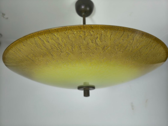 Una hermosa y original lámpara colgante del período de entreguerras (circa 1930-1940), con un gran cuenco de vidrio opalino amarillo soplado a mano con una textura craquelada natural. El vidrio está hecho de vidrio multicapa encamisado, con la capa de vidrio transparente de soporte visible en el orificio de montaje, un sello distintivo del vidrio soplado a mano de alta calidad.