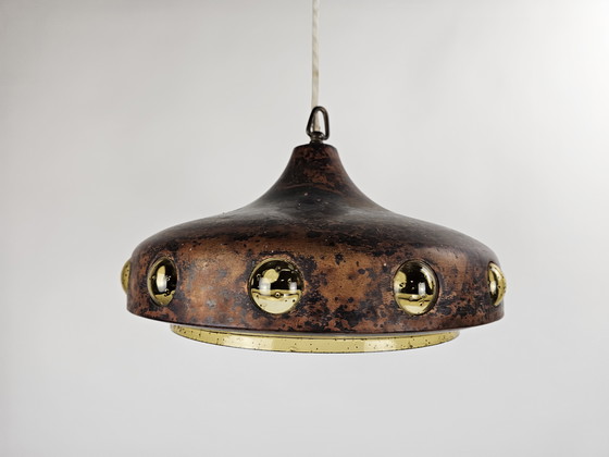 Experimente la elegancia atemporal de esta lámpara colgante diseñada por Nanny Still. Con su combinación única de cobre y cristal ámbar, esta lámpara irradia un brillo cálido y acogedor, perfecto para cualquier habitación a la que le venga bien un toque de encanto vintage.
