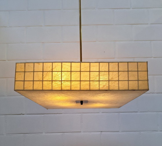 Aún en buen estado y en pleno funcionamiento, esta lámpara colgante cuadrada de la década de 1950 irradia encanto vintage con su diseño único.