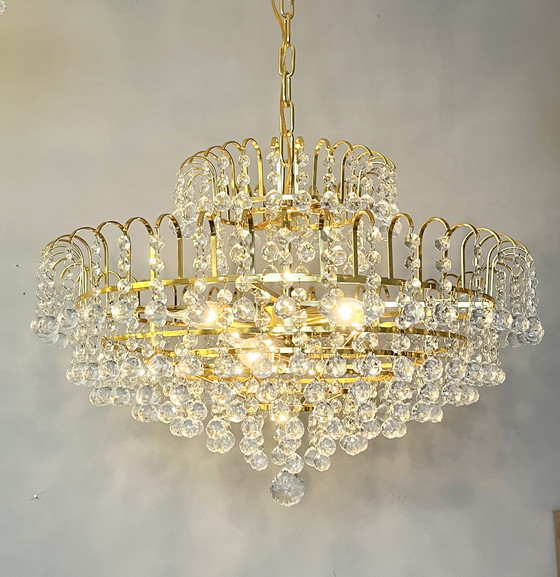 ¡De gran tamaño! ¡Qué preciosas lámparas colgantes! ¡Las más bonitas que he visto nunca! Con más de 200 esferas facetadas de cristal tallado, en un estilo moderno de mediados de siglo. La combinación con el marco dorado curvado las convierte en un verdadero imán de miradas. Auténticas joyas vintage de Hollywood. En perfecto estado y completas. De la marca Cristalstrass. Dimensiones: 60 cm de ancho y 40 cm de alto (medidas sin cadena ni placa de techo). 80 cm de alto con cadena (se puede acortar). ¿Prefieres envío? ¡Es posible! Por supuesto, irán bien embaladas.