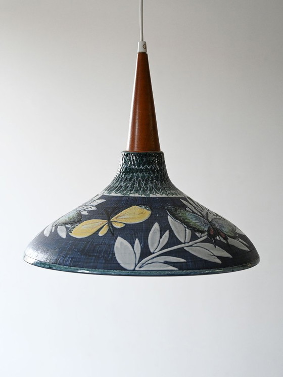 Refinada lámpara colgante de cerámica esmaltada de "Tilgmans Keramik", atribuida a Marian Zawadzki y producida a finales de la década de 1950/1960. La pantalla acampanada presenta un rico esgrafiado con mariposas y motivos botánicos, una firma inconfundible del taller de Gotemburgo de la época. Una superficie brillante y policromada sobre un fondo azul intenso se combina con un cuello de teca torneada, un cálido contrapunto que subraya la sensibilidad escandinava por los materiales. El ligero esmalte interior proporciona un brillo suave y uniforme.