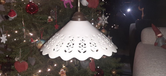 Diámetro 30 cm. Cerámica blanca. También disponible en una versión más pequeña. Perfecta para un ambiente rústico. El sistema de montaje y suspensión también es original. Este diseño, junto con los pequeños orificios, crea al instante un ambiente cálido y acogedor sobre la mesa.