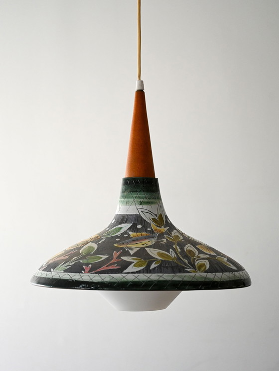 Lámpara colgante escandinava de los años 50, atribuida a Marian Zawadzki para Tilgmans. El cuerpo de cerámica vidriada presenta motivos florales pintados a mano sobre fondo oscuro, característicos de la estilizada decoración de la artista. La tapa cónica de madera añade un elegante contraste de materiales.