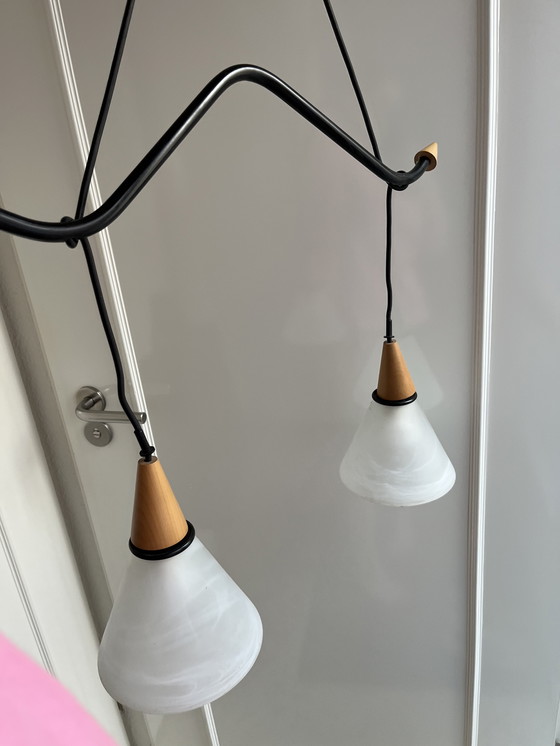 * Preciosa lámpara de techo vintage original con dos puntos de luz ajustables, acabada en metal negro, cálidos detalles de madera y pantallas de cristal esmerilado. El diseño minimalista pero cálido es típico del estilo escandinavo de los años 60 y confiere a cualquier interior un aspecto atemporal. Perfecta para colocar encima de la mesa del comedor, en el recibidor o como punto de atracción en el salón.