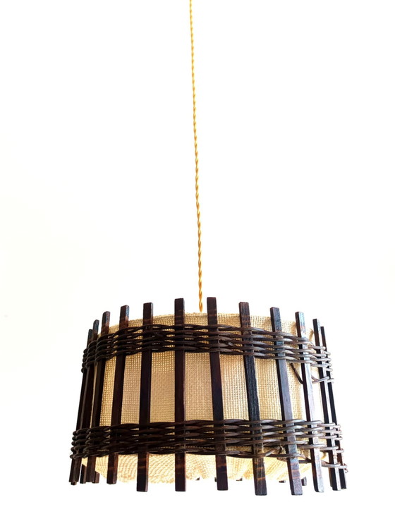 Lámpara colgante compuesta por varillas de madera oscura unidas por un tejido de ratán oscuro, que encierra una pantalla revestida con una tela tipo arpillera beige. Electrificación limpia y funcional, restaurada: casquillo E27, cable eléctrico de tela trenzada dorada y florón metálico dorado. En muy buen estado, con algunas señales de desgaste (decoloración). Emite una hermosa luz cálida al encenderse. 31,5 x 19 cm. Longitud del cable: 90 cm. Envío limpio, rápido y seguro.
