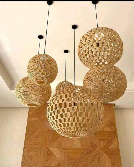 Estas hermosas lámparas están hechas a mano con rafia por nuestros artesanos en Marrakech.