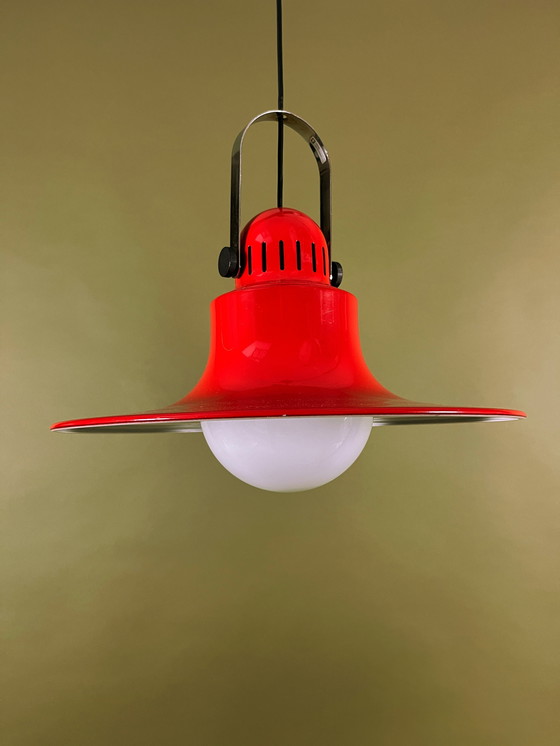 Preciosa lámpara colgante vintage de Aneta (Växjö, Suecia), diseñada por Jan Wickelgren. Diseño escandinavo con pantalla de metal rojo y globo de cristal opalino.