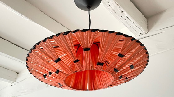 Una lámpara hecha de cintas sintéticas en tonos rojo, naranja y negro, tensadas y anudadas sobre una estructura de acero: una auténtica maravilla luminosa y colorida.