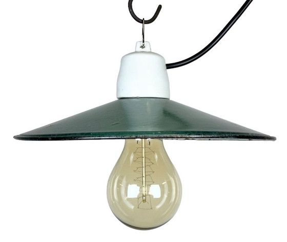 Lámpara colgante vintage industrial esmaltada, fabricada en Polonia en la década de 1970. Presenta una pantalla de esmalte verde con interior de esmalte blanco y tapa de porcelana. El casquillo funciona con bombillas E27/E26. El peso de la lámpara es de 0,5 kg. Cable nuevo.