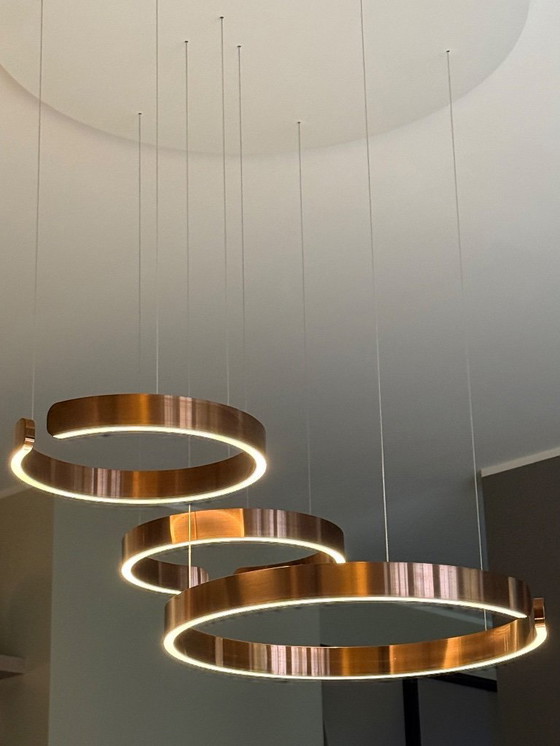Lámpara colgante Occhio. Tres anillos (2 x 40 cm, 1 x 60 cm) en oro rosa. Incluye soporte de techo a medida (Cone Lighting Antwerp). Perfecto estado. 3 años de antigüedad.