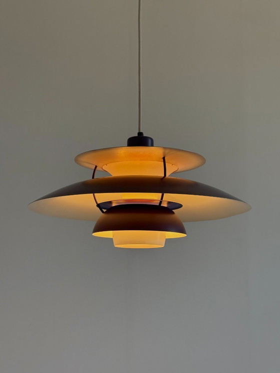Una lámpara de diseño icónica: la lámpara colgante PH5 de Poul Henningsen para Louis Poulsen, diseñada en la década de 1950. Esta versión es de color púrpura con sutiles acentos blancos y naranjas en el interior de las capas. Gracias a su diseño en capas, la lámpara difunde una luz suave y difusa que crea un ambiente cálido. Perfecta encima de la mesa del comedor, en el recibidor o sobre un escritorio. Teniendo en cuenta su antigüedad, la lámpara está en buen estado vintage y sigue siendo una declaración atemporal en cualquier interior.