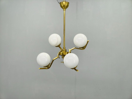 Esta elegante pieza presenta una sólida estructura de latón con cuatro globos de vidrio opalino. Su sistema de brazos ajustables permite colocar los globos hacia arriba, hacia abajo o en ángulos intermedios, ofreciendo flexibilidad funcional y variedad visual.