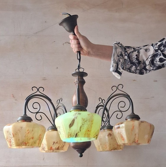 Preciosa lámpara de araña Art Déco con 5 pantallas de cristal de uranio.