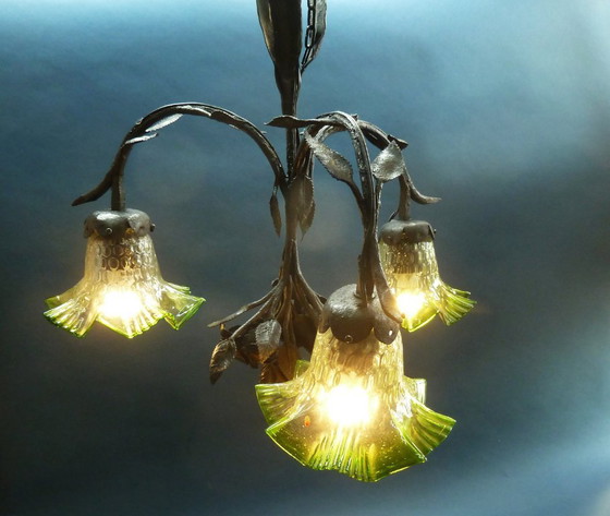 Lámpara de araña de hierro forjado atribuida a LODEWIJK VAN BOECKEL. Tiene tres brazos decorados con preciosas rosas y hojas. Esta lámpara se encuentra en excelentes condiciones, tras una cuidadosa restauración y con el cableado eléctrico completamente reemplazado. Las pantallas de cristal, de color verde y en muy buen estado, crean un efecto de iluminación espectacular al encenderse. Dimensiones: pantallas de 25/10 cm, altura de la lámpara: 50 cm, ancho: 43 cm.