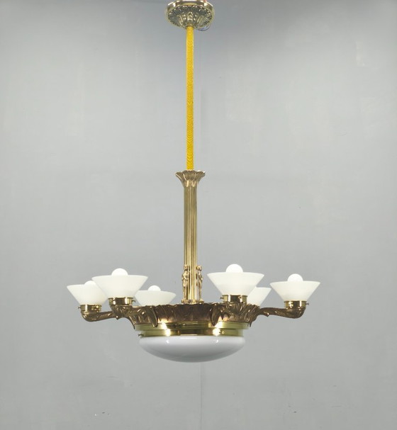Los refinados detalles decorativos en la columna central y los brazos realzan la lujosa estética típica del período Art Déco. El cálido acabado en latón, combinado con la suave iluminación del cristal, crea una atmósfera sofisticada, convirtiendo esta lámpara de araña en la pieza central perfecta para comedores, salas de estar o interiores de alta gama.