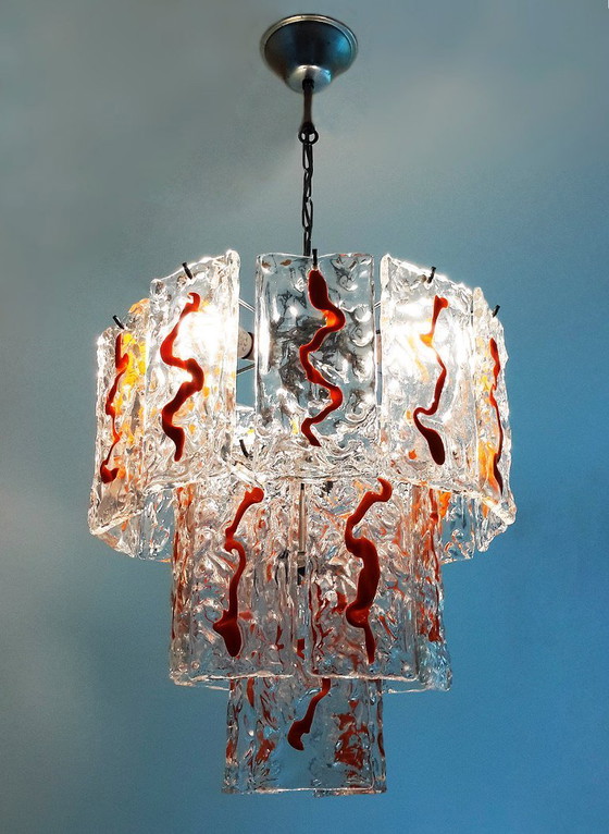 Esta lámpara consta de 21 paneles de cristal de Murano estructurado, cada uno único por su elaboración artesanal. Una forma de color naranja rojizo claro (RAL 2008) se encuentra integrada en el cristal transparente mediante la técnica "Incamiciato".