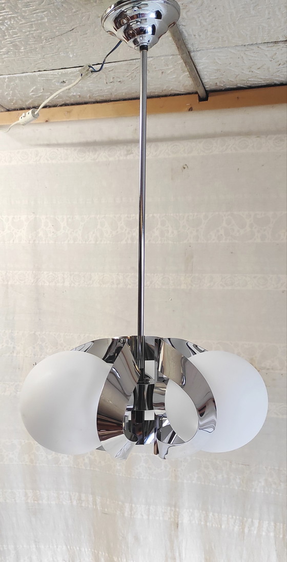 Lámpara de araña de estilo futurista en cromo y cristal opalino - década de 1970