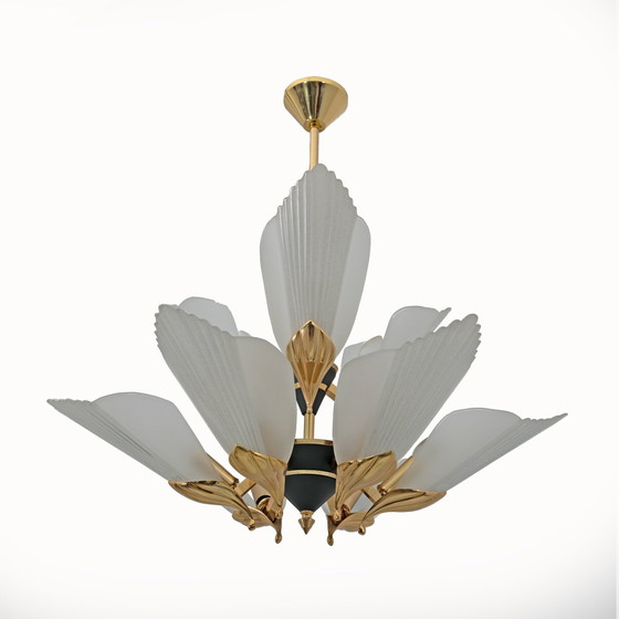Rara lámpara de araña de nueve luces, marca F. Fabbian. Italia, década de 1980. La estructura es de latón y metal dorado, mientras que las pantallas son de cristal artístico grabado al ácido en forma de pétalo. Recableada para Europa y EE. UU. con portalámparas E14 o E12.