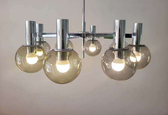 Esta elegante lámpara de araña cromada de la década de 1960 fue fabricada por Kaiser Leuchten Alemania. La lámpara tiene un característico estilo de mediados de siglo con una hermosa estructura geométrica. Es pura y sencilla, y proporciona una hermosa luz gracias a sus ocho bolas de cristal ahumado soplado a mano sobre un marco cromado. Esta lámpara se encuentra en muy buen estado. Sus dimensiones son las siguientes: altura 69 cm, diámetro 80 cm. Debido a su peso y fragilidad, no se puede enviar.
