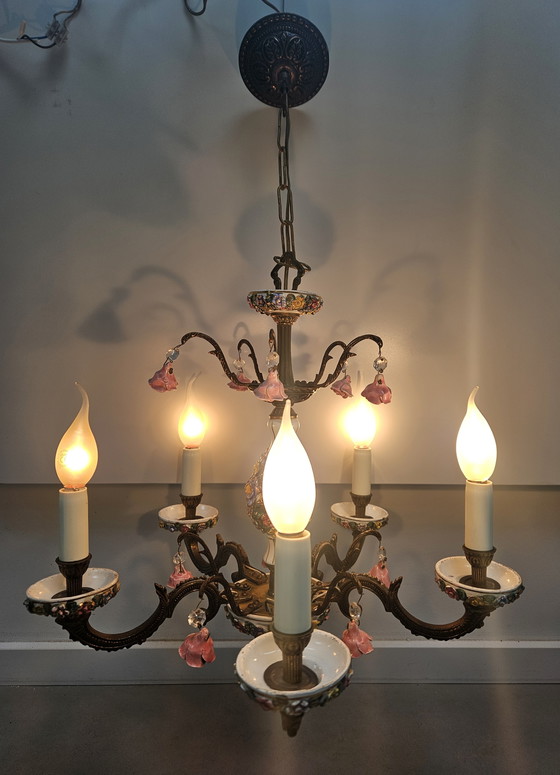 Preciosa lámpara de araña italiana original de la década de 1950, fabricada en bronce y porcelana.
