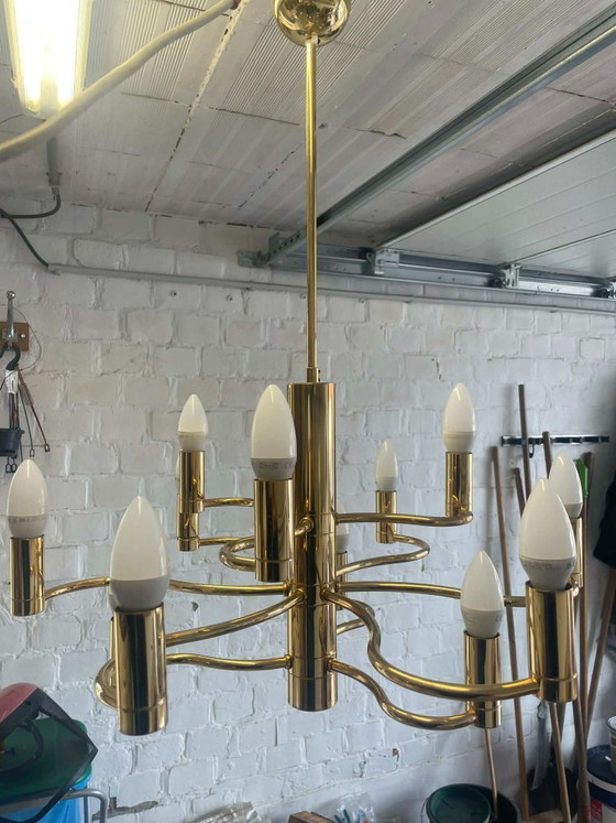 Experimente la elegancia atemporal de esta lámpara de araña de estilo moderno de mediados de siglo, diseñada por la reconocida firma SA Boulanger et Sciolari. Con su impresionante diseño de 12 brazos y su radiante acabado dorado, esta lámpara añade un toque de sofisticación a cualquier estancia.