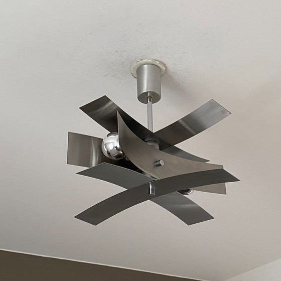 Lámpara de araña Sputnik. 1970. Era espacial. Acero cepillado.