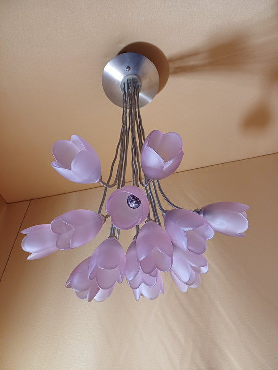 Lámpara colgante única del diseñador holandés Harco Loor, de Haarlem, Países Bajos. Esta lámpara pertenece a una colección anterior y ya no se fabrica. Está fabricada en robusto acero inoxidable y cuenta con 15 delicadas tulipas lila mate en los extremos de los brazos flexibles. Está hecha de cristal italiano. Las tulipas miden 8,5 x 5,5 cm. Es una lámpara robusta, de 95 cm de largo desde el techo y 52 cm de diámetro. Cuenta con un característico rosetón con el logotipo de Harco Loor. Esta lámpara será un verdadero punto de atracción en su interior. Quedará preciosa sobre una mesa de comedor, una mesa de centro, un altillo o un pasillo. Utiliza bombillas halógenas regulables. También se puede convertir a iluminación LED.