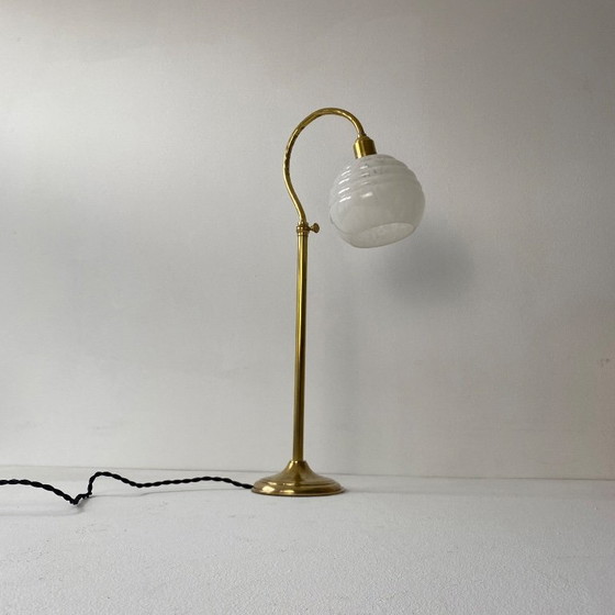 Rara lámpara de escritorio de los años 1940-1950 con cuello de cisne. Toda de latón excepto la pantalla de cristal Clichy.