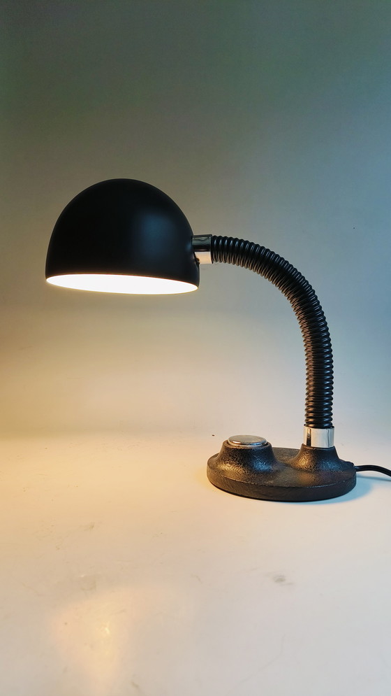 Esta lámpara de escritorio Hillebrand Bauhaus de la década de 1970 es un gran ejemplo de diseño funcional. La lámpara está fabricada en metal resistente y presenta un elegante acabado en negro con detalles cromados. El brazo flexible facilita el ajuste de la incidencia de la luz, ideal para entornos de trabajo o lectura. Una pieza atemporal que añade estilo y funcionalidad a cualquier habitación.